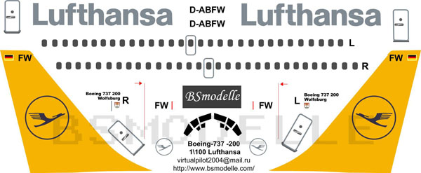 Лазерная декаль Боинг 737-200 Люфтганза "желтый" D-ABFW масштаб 1\144